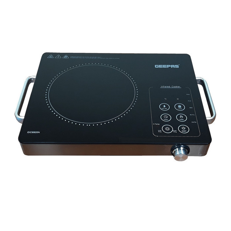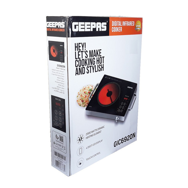 شرکت جی پاس GEEPAS با عرضه بیش از 1500 کالا در زمینه لوازم برقی و خانگی و ... بیش از 37 سال است که در آسیا و اروپا و قاره آمریکا فعالیت مستمر دارد.اجاق گاز مادون قرمز ( Infrared) یا بعبارتی اجاق برقی القایی مدل GIC6920N با دارا بودن صفحه شیشه ای مشکی یک دست بسیار مقاوم به حرارت بطور یکدست در بالای اجاق ، تنها حرارت را در محدوده دایروی که با خط چین نیز مشخص شده است ایجاد می کند و در بقیه مناطق صفحه دما کاملا با دمای محیط یکسان است .می توان هر گونه ظرفی را برروی دستگاه قرار داده و دمای حرارت ساطع شده را از 60 درجه تا 2000 درجه سانتیگراد تنظیم کرد . اجاق دارای صفحه نمایش سون سگمنت با 4 رقم می باشد که می توان دما و زمان تنظیم شده تایمر و ولتاژ برق را نیز مشاهده کرد. گرمای ساطع شده را می توان در دو حالت حلقوی و یا مرکزی و نیز ترکیب این دو با هم ایجاد کرد.دستگاه دارای قفل می باشد که با نگه داشتن بمدت 5 ثانیه فعال و نیز به همین صورت غیر فعال می شود . کل عملیات کنترل بطور کامل لمسی است . توان حرارتی دستگاه 2000 وات می باشد دستگاه از تایمر 3 ساعته برخوردار می باشد .با روشن شدن دستگاه فن آن به کار می افتد و بعد از خاموش کردن دستگاه نیز تا هنگام خنک شدن کامل دستگاه جهت جلوگیری از آسیب رسیدن به دستگاه و یا کاربر ، فن کار می کند و بطور خودکار خاموش می شود پس دستگاه را تا هنگام خاموش نشدن فن از برق نباید خارج کرد .دستگاه دارای 3 شاخه خارجی مجهز به فیوز داخلی جهت حفاظت از شبکه برق خانگی و خود دستگاه برخوردار است.