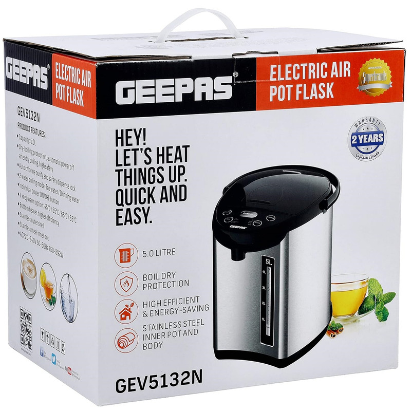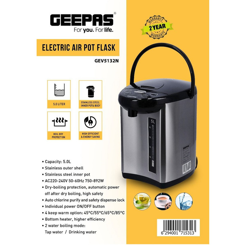 ظرفیت 5 لیتر پوسته بیرونی ضد زنگ قابلمه داخلی فولاد ضد زنگ AC 220-240 V 50-60 هرتز 750-892 W محافظ جوش خشک: خاموش شدن خودکار پس از جوشیدن بدون آب، ایمنی بالا تصفیه خودکار کلر و قفل توزیع ایمنی دکمه روشن/خاموش جداگانه