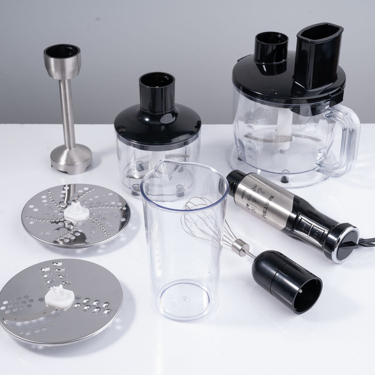 دارای ظرف غذاساز با ظرفیت 1750میلی لیتر/ظرف خردکن با ظرفیت 400 میلی لیتر/لیوان با ظرفیت 0.6 لیتر/سری همزن/دو صفحه برای رنده کردن